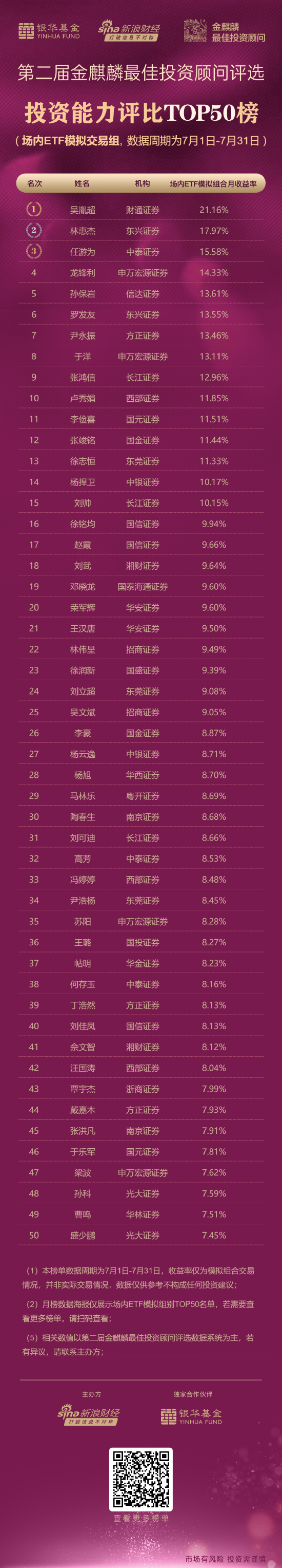 目前金麒麟最佳投资顾问评选火热进行中!股票模拟交易、场内ETF模拟交易、公募基金模拟配置、社交服务评比……万名投顾大PK,首月(7月)月榜数据(周期为7月1日-7月31日)显示,场内ETF模拟组合评比中,财通证券投资顾问吴胤超(来自上海漕溪路证券营业部)以月收益率21.16%居月榜首位。