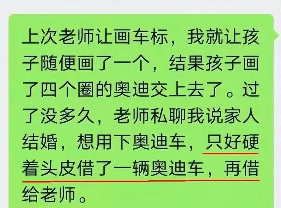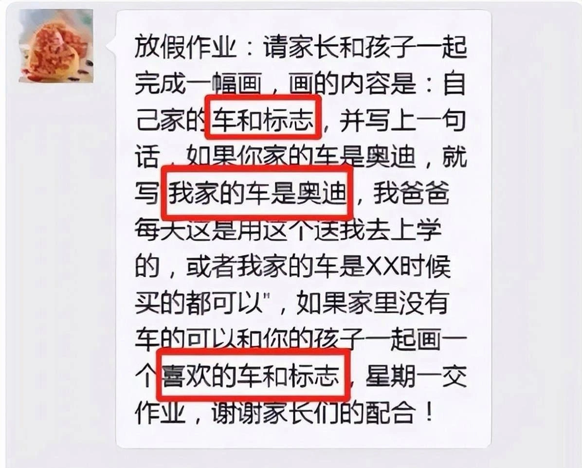 更讽刺的是,比“摸家底”更令人无法接受的,是一些老师的后续操作,网上有家长吐槽:在完成了“画出家中车标“的作业后,班主任竟然主动提出借用他们的车。