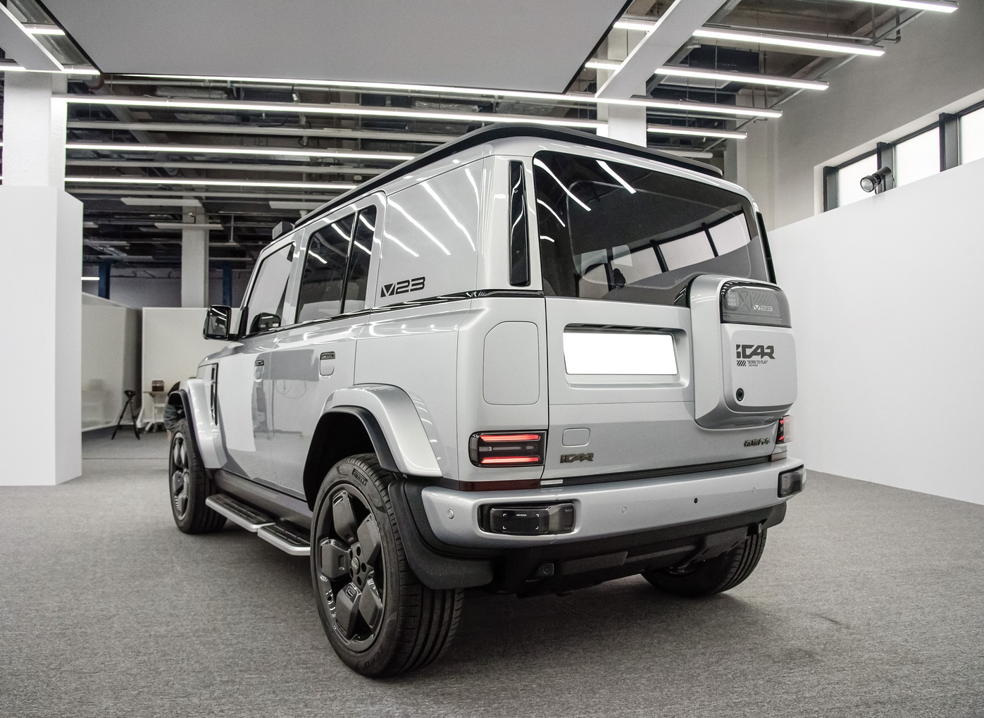 车尾部分的造型则是垂直的平直造型,呼应了车身侧面的造型,提升了不错的整体感,而大面积的挡风玻璃两侧还有着竖置的熏黑饰条镶嵌,尾灯的位置较为靠下,就在保险杠上方,就像是奔驰大G的造型一般,有着不错的辨识度,而小书包则是设计在了尾门一侧的部位,看起来应该是类似于储物空间的设计,主要是增加车尾的美观,保险杠的造型也是与车头相呼应,提升了整体感。