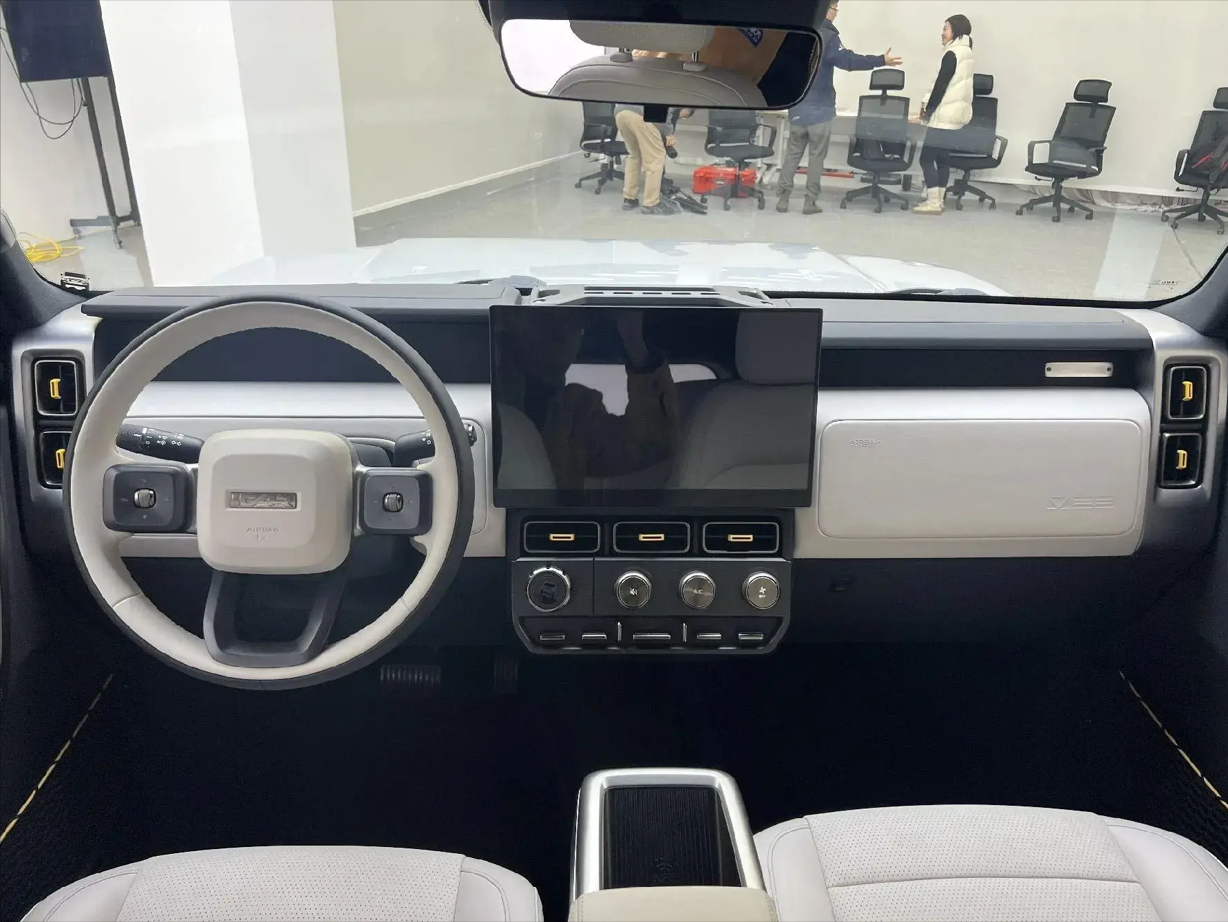 进入车内,行车平直的中控台部分配备有大尺寸的悬浮式中控屏,车机系统搭载8155芯片,科技感表现不错,并且中央悬浮式的液晶大屏下方设置有物理按键与旋钮按键,操作起来还是很方便的。配置方面,iCAR V23装备有热泵系统、燕飞利仕音响系统,仪表盘和行李架可以选装。中控台与扶手区域分体式的设计还有效的增加了前排的腿部空间。